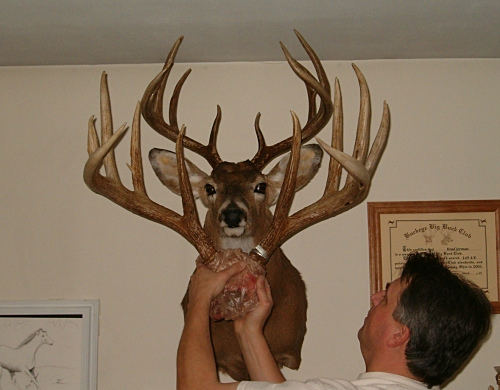 I thought my 155" deer looked good on the wall... Well it does, but it is no world class deer. There isn't any trick photography here. The skull cap is under my other deer's jaw and the Jerman Buck's G2s are outside of a 19-2/8" spread!